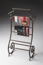 FREE SHIPPING 3041025 MAGAZINE RACK BUTLER SPECIALTY; COLLECTION: METAL WORKS Model: 3041025 Shipping Weight: 29lbs Description: 20"W, 10"D, 34"H Functional and refined, this magazine rack is an ideal addition in any reading space. The all metal construction features scroll design details in a pewter finish with gold highlights. Metalworks Finish UPS/FedEx?: Yes