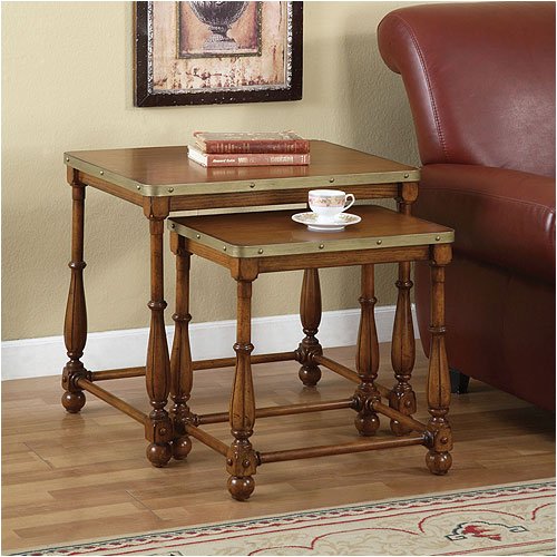 2 pc Nesting Accent Tables with Antique Brass Framed Top in Woodland Oak Finish Review