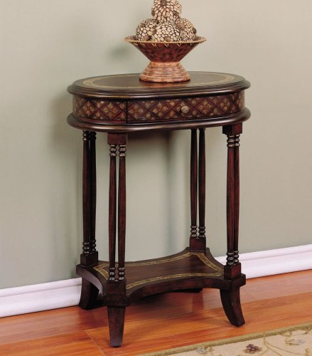- This traditional oval shaped accent table features English lattice leaf pattern hand painted on its apron rail as well as on a parchment border on its top and display shelf.