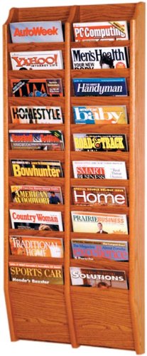 Magazine & Literature Storage Oak wall racks neatly display and organize magazines. Overlapping design allows more magazines to be displayed in a smaller amount of space. These magazine racks are constructed with 3/4" solid oak sides and sealed with a durable state of the art finish. The pockets are 9" wide by 3/4" deep. Available in Light Oak, Medium Oak and Dark Red Mahogany. All racks are pre-drilled and include hardware for easy wall mounting.