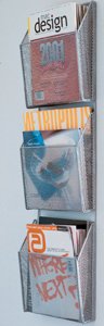 Space-saving wall rack holds magazines and more! You'll find many uses for this stylish metal mesh organizer. The vertical wall magazine rack has 3 baskets for neatly storing periodicals, catalogs, mail and other papers. Makes a great alternative to the classic in/out box, too. Each mesh basket has a cutaway front for easy access to contents. This wall magazine holder is practical and attractive paperwork storage solution for home or office - keeps clutter off your desk or kitchen table. The magazine display rack is also handy by your entryway door for outgoing mail, coupon books, school papers and other "don't forget" items! Metal magazine rack mounts easily to any wall or door. Mounting hardware is included. Find out just how many ways in which this magazine basket rack could be useful in your home or office! .
